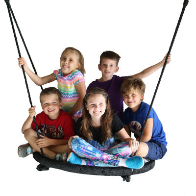 Take a new spin on summertime swings with the web riderz nest swing. The built in handlebars and foot loops provide a safe ride for your children. Crafted with durable powder coated steel tubing this round web swing is strung and hung with uv resistant polyethylene rope.